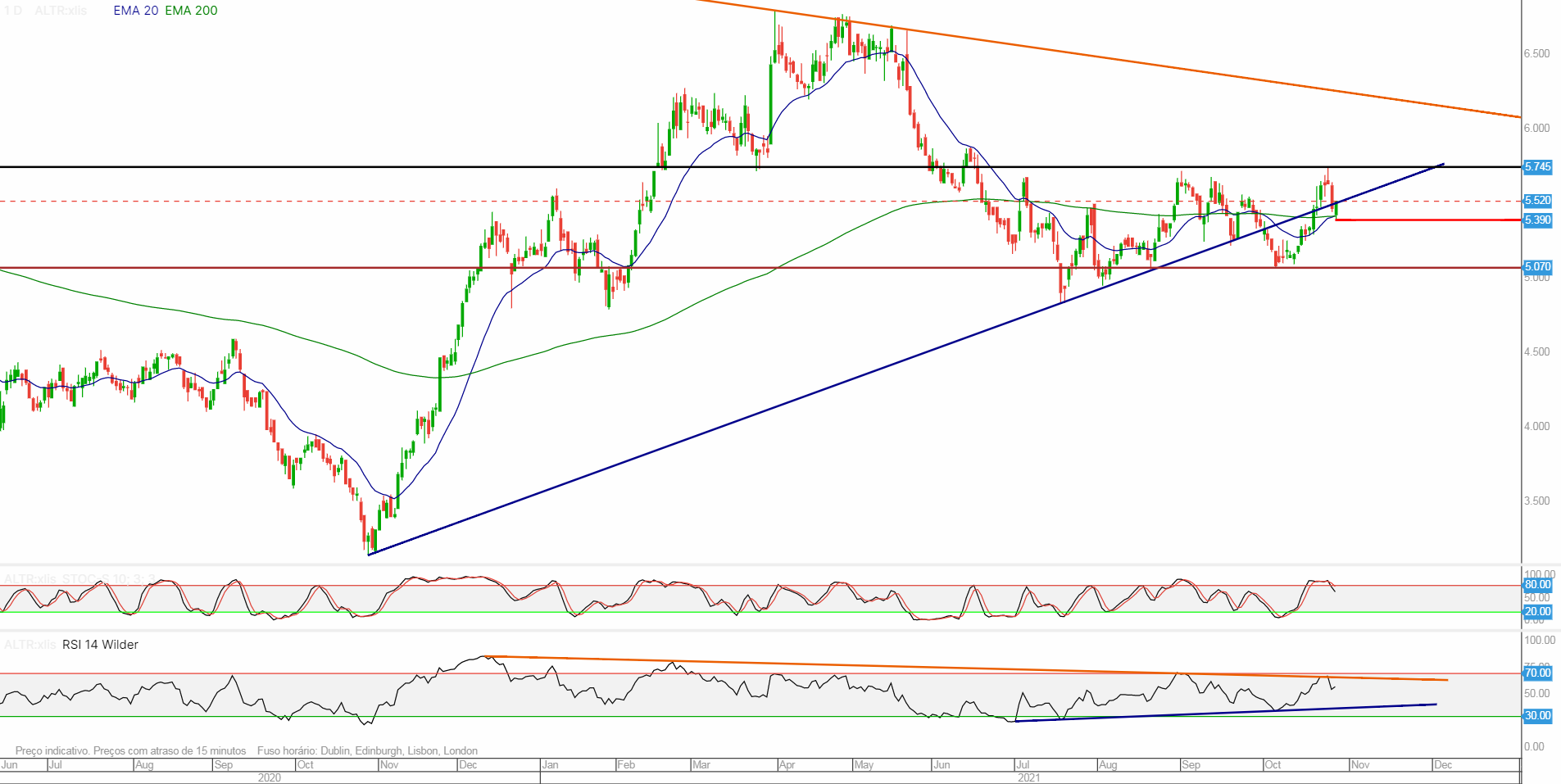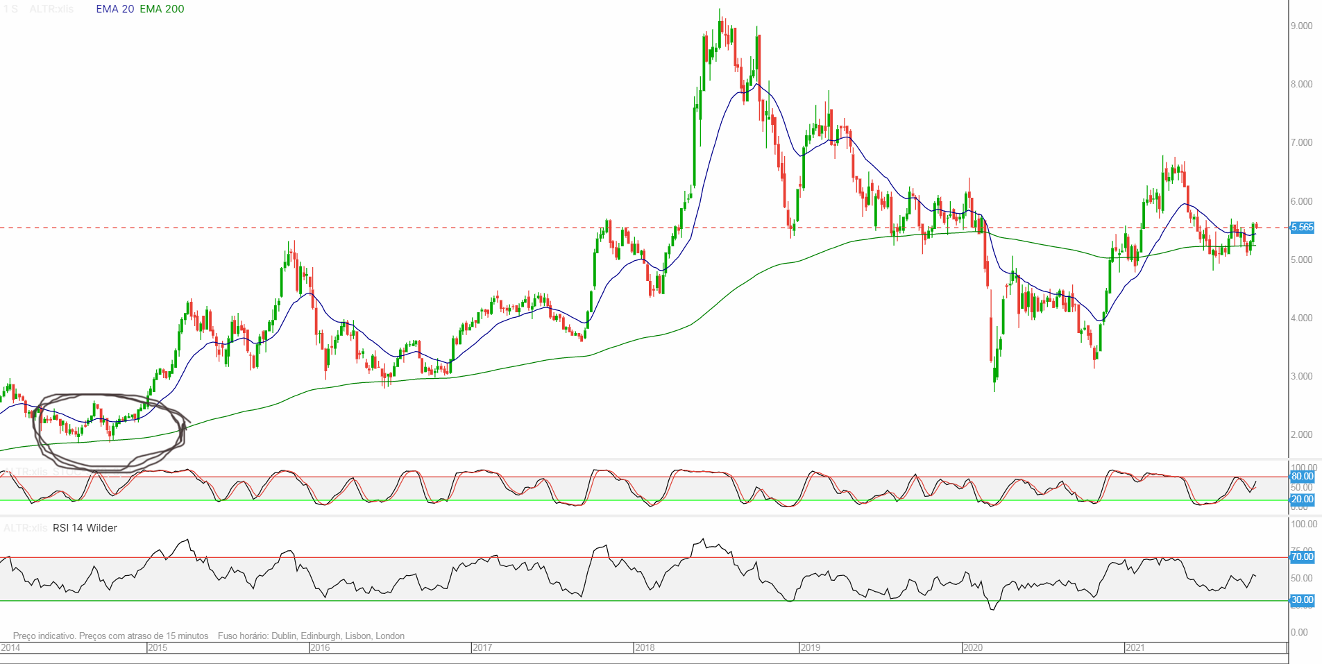 Nos gráficos vemos a cotação acima das médias móveis de 20 e 200 (dias / semanas). Enquanto assim permanecerem parece-me muito positivo