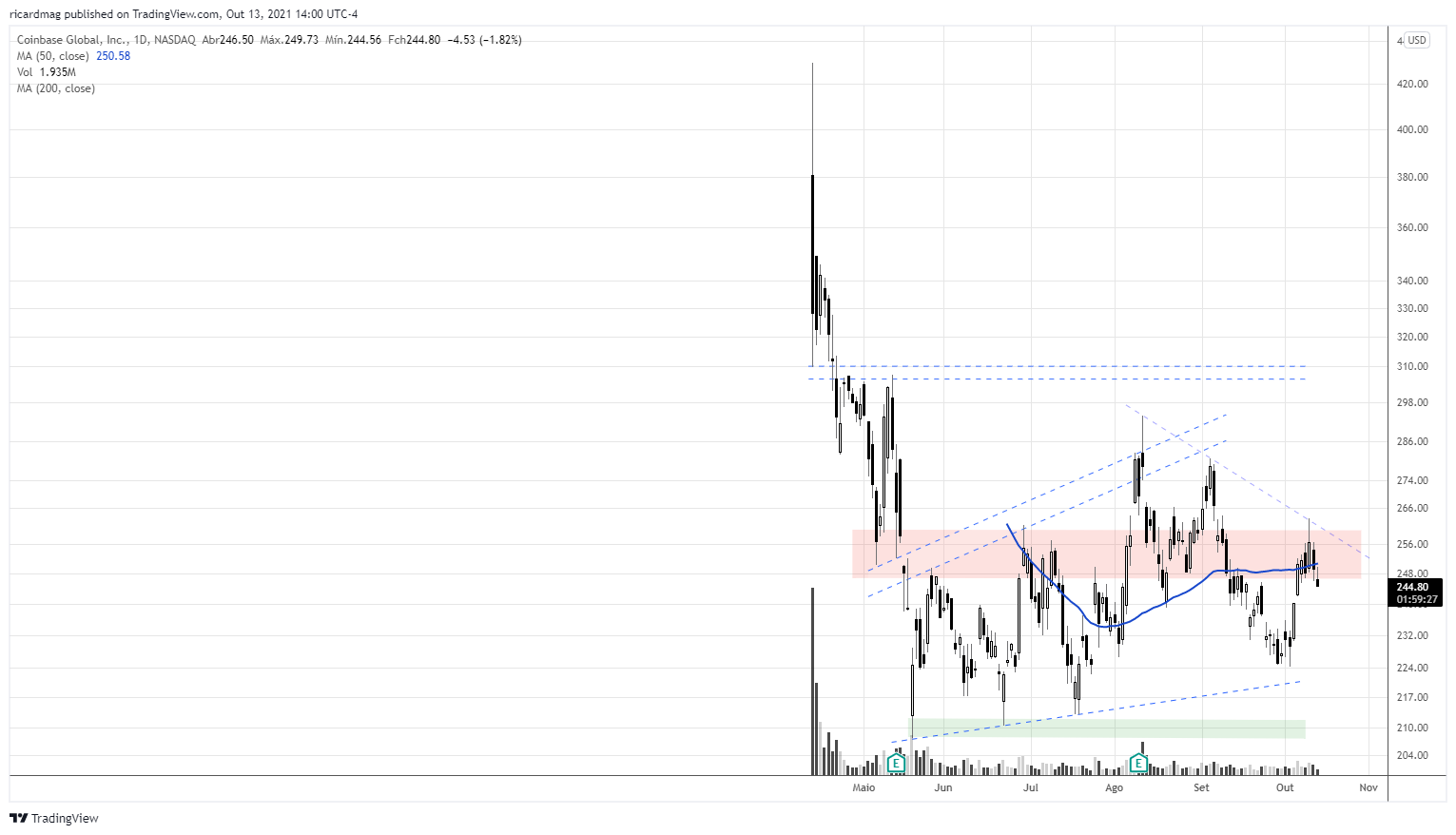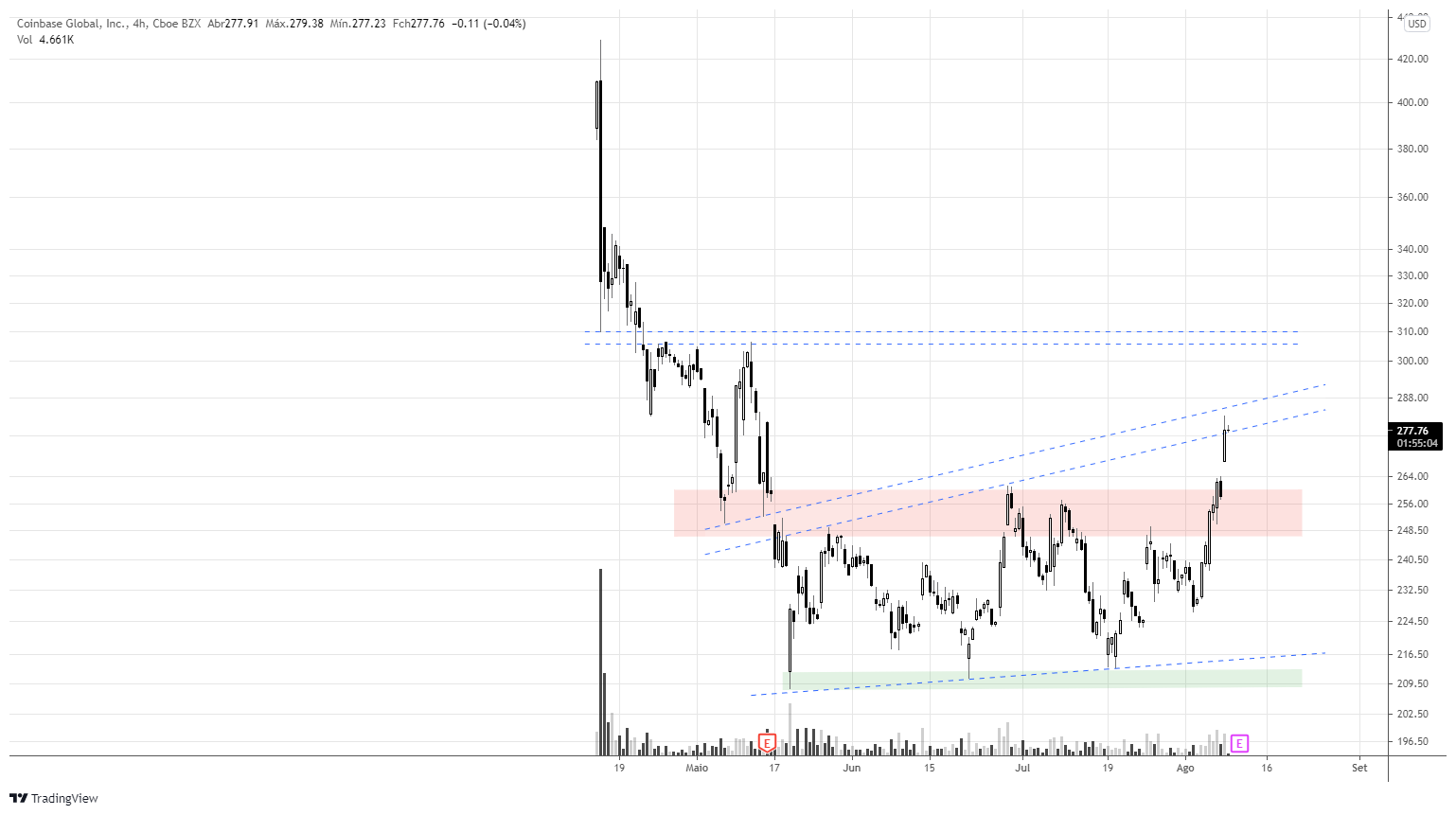 A Coinbase tem um bom suporte ali próxino de 220, mas todo o cuidado é pouco. As criptomoedas são o que são: