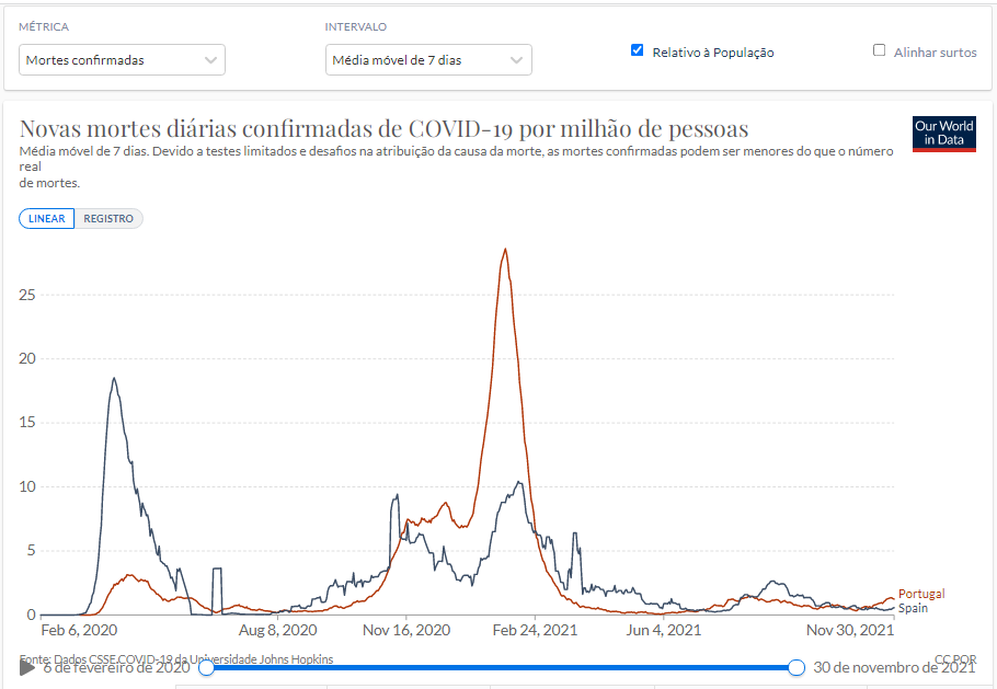 Além disso, se compararmos Portugal com... Portugal (este Novembro com o anterior Novembro), temos entre 10 a 20 por dia, média pouco superior a dez óbitos a lamentar, quando há 12 meses, era entre os 40 e os 60 por dia.