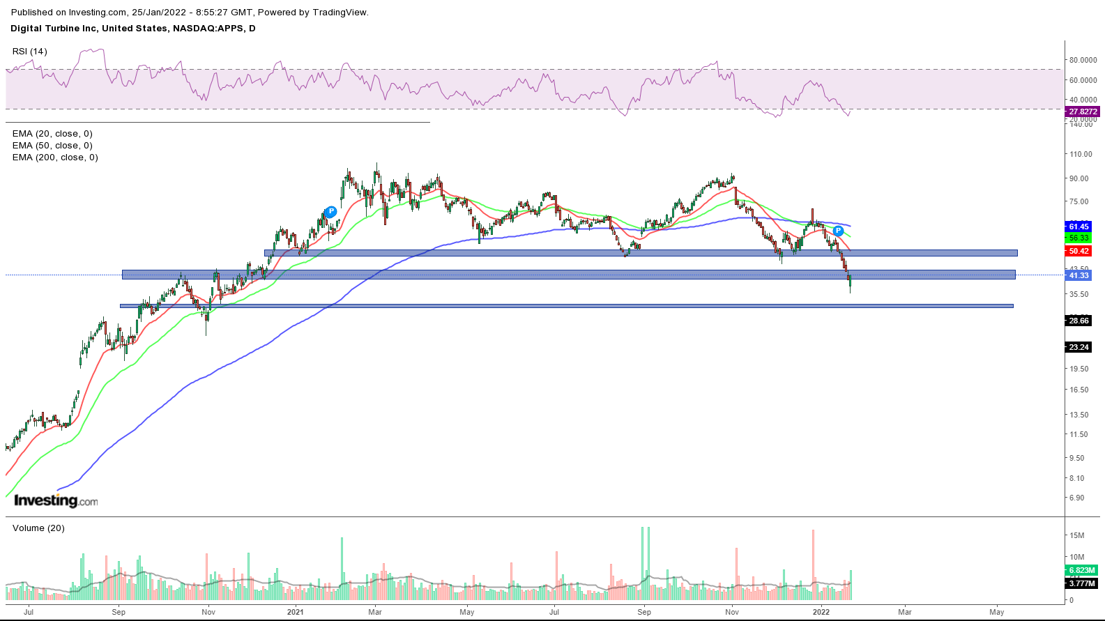 A $APPS atingiu valores que eu pensava não serem possíveis, acompanhando o sentido descendente do mercado, tendo feito mínimos na zona dos $35.