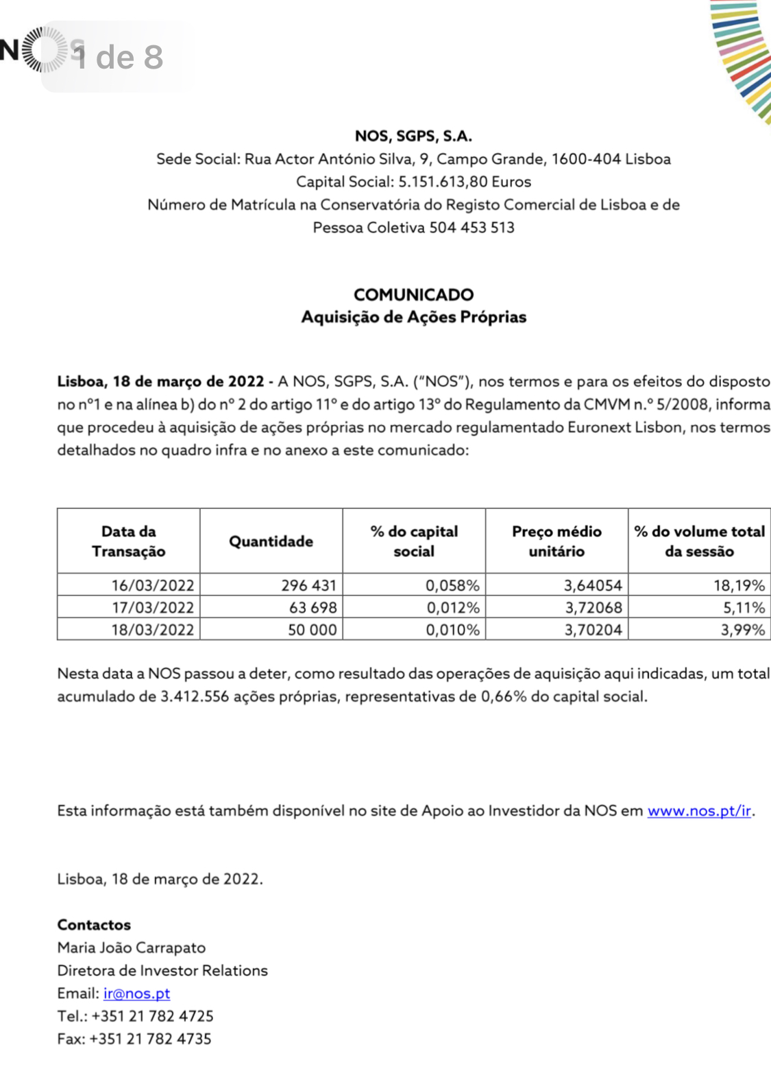 Àlvaro Escreveu:Anunciou e já está a comprar há vários dias. Penso que este target desastroso se deve ao que aí vem em termos de concorrência e ao facto do 5G ter prometido muito e cumprido pouco, mas a ideia da NOS é boa, seguram a cotação e sacam o dividendo.