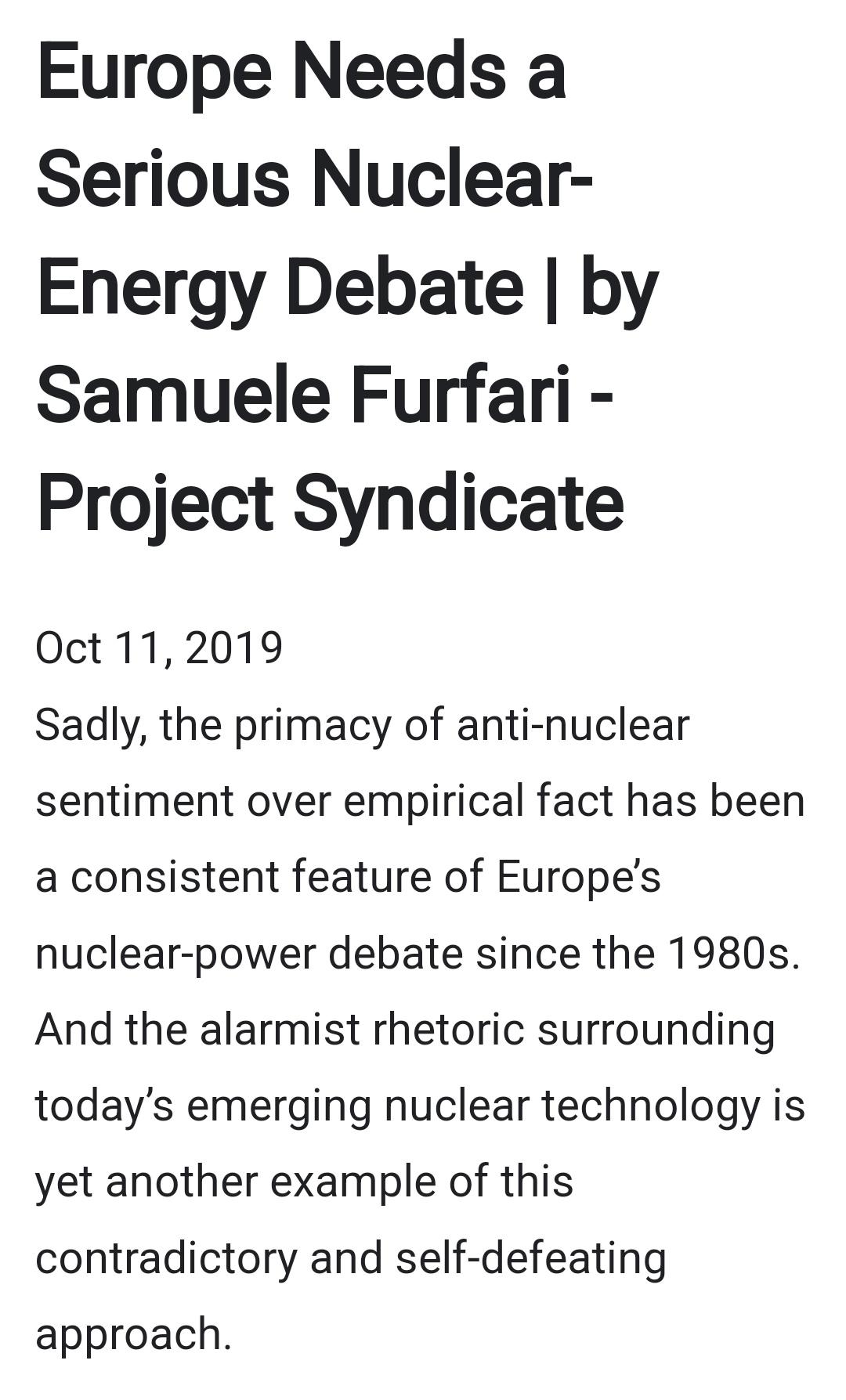 Os riscos potencias do recurso ao nuclear são incomparavelmente inferiores ao do não proliferação desta fonte de energia. Neste momento potencialmente já se tinha evitado uma guerra com a Rússia, tínhamos independência energética total e estávamos com emissões 0 (a gerar eletricidade). Bastava ter investido em nuclear nos últimos 20 anos,