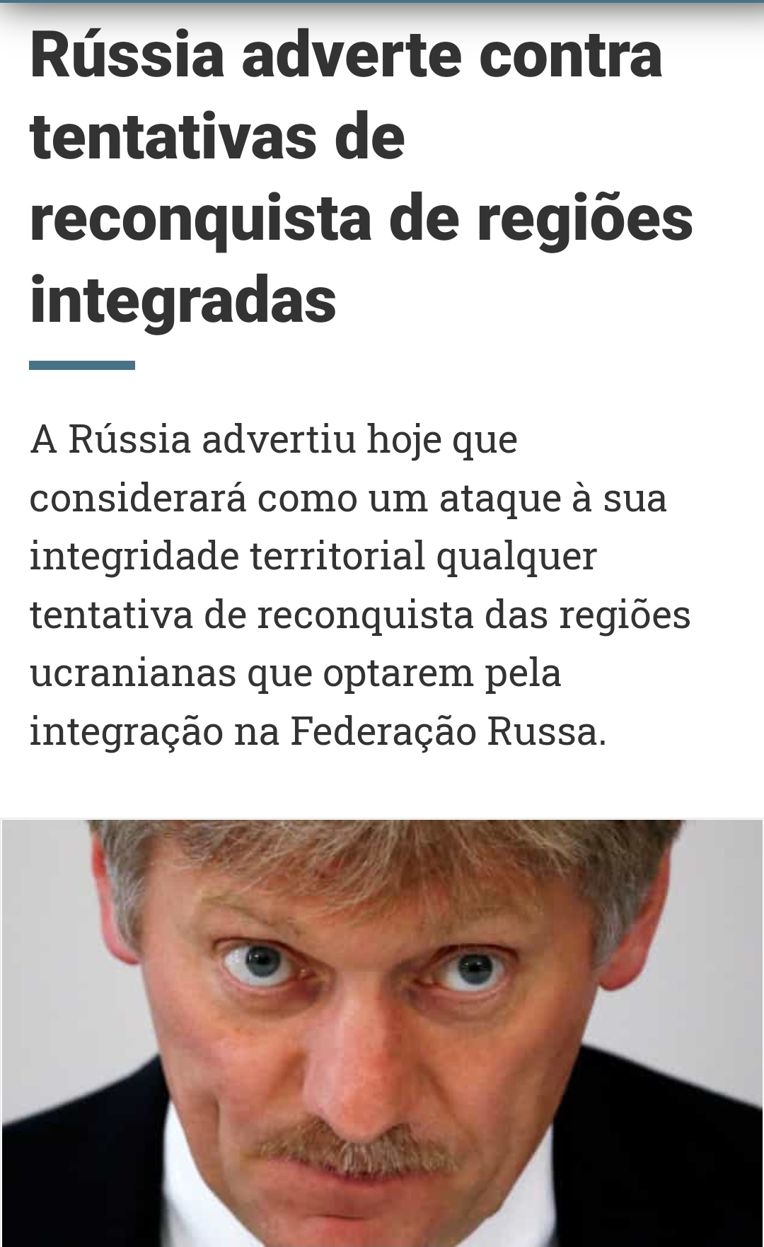 - há uma nuance entre duas das regiões e as restantes (que supostamente não entrarão na Rússia em iguais moldes e as que entram de forma mais efectiva eram as que já estavam em grande parte tomadas antes da invasão de 2022) e creio que Peskov não esclareceu em relação a isto;