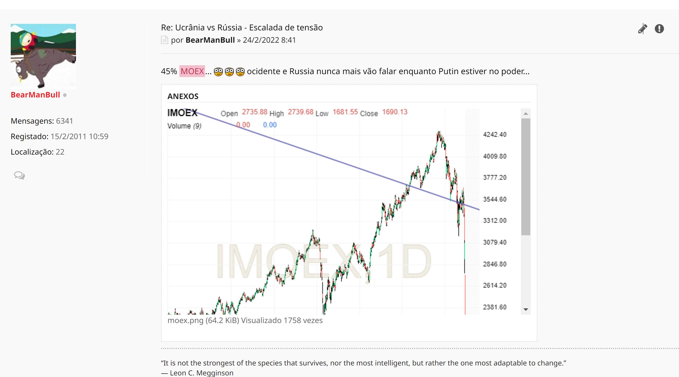 mais_um Escreveu:Já agora, desde ter sido decretado a mobilização parcial pelo Putin as bolsas russas têm estado a cair a pique, dos máximos do ano passado estão com quedas de 50% ou mais.