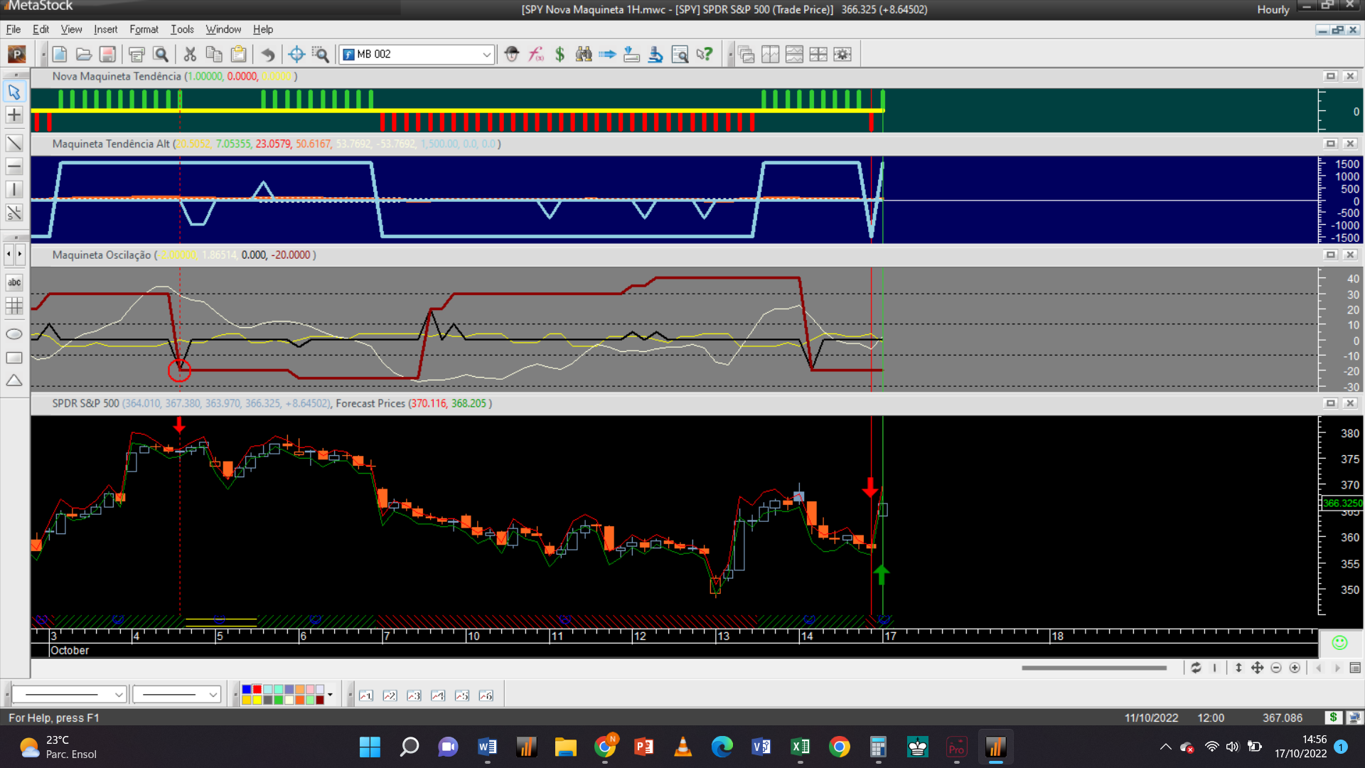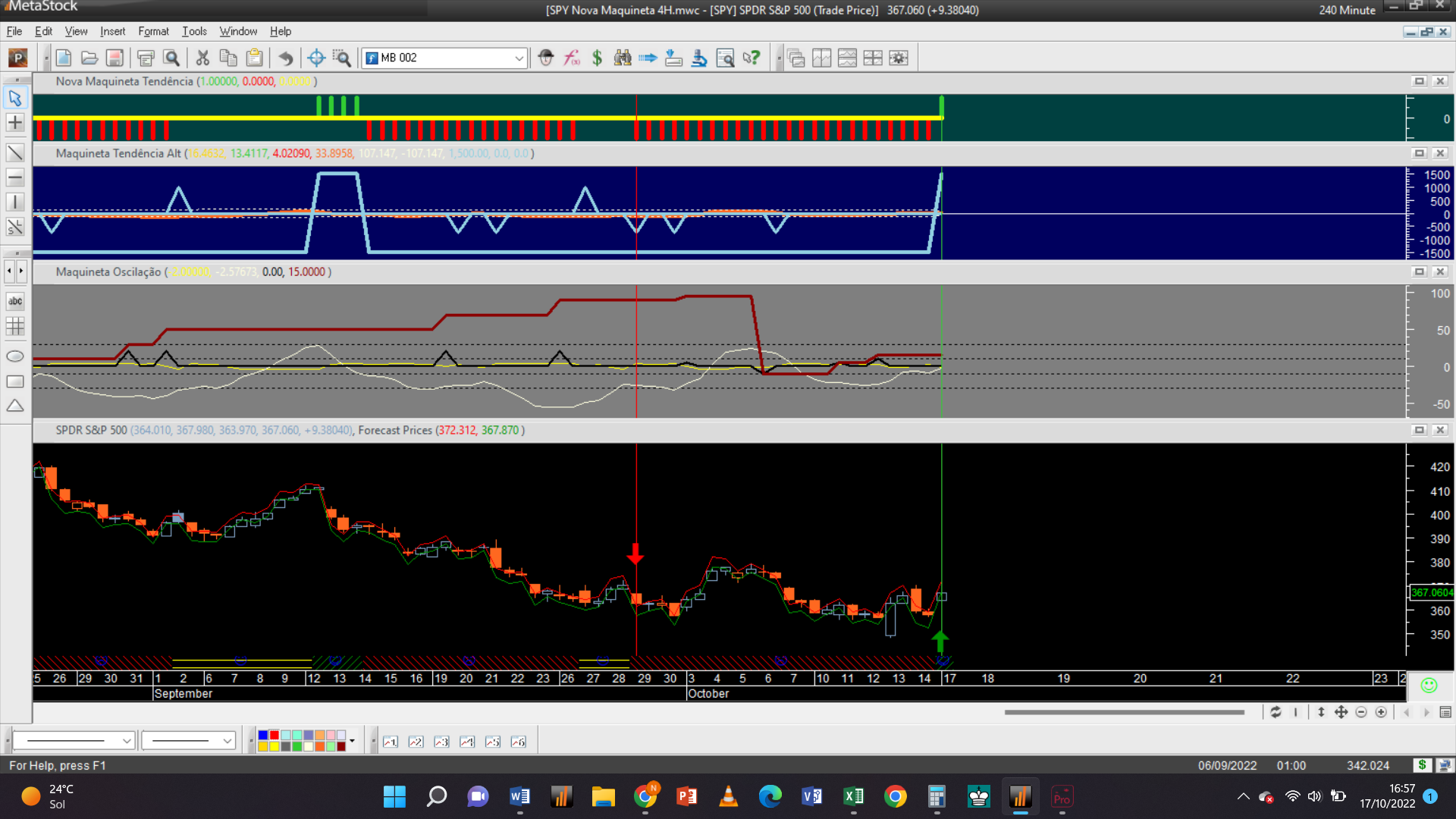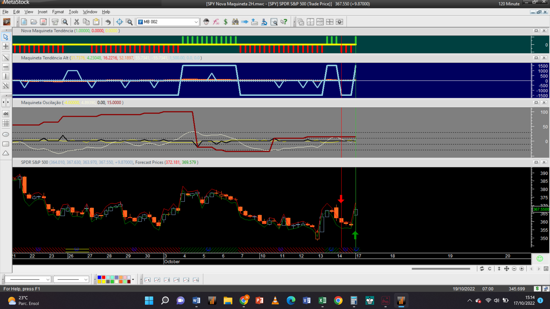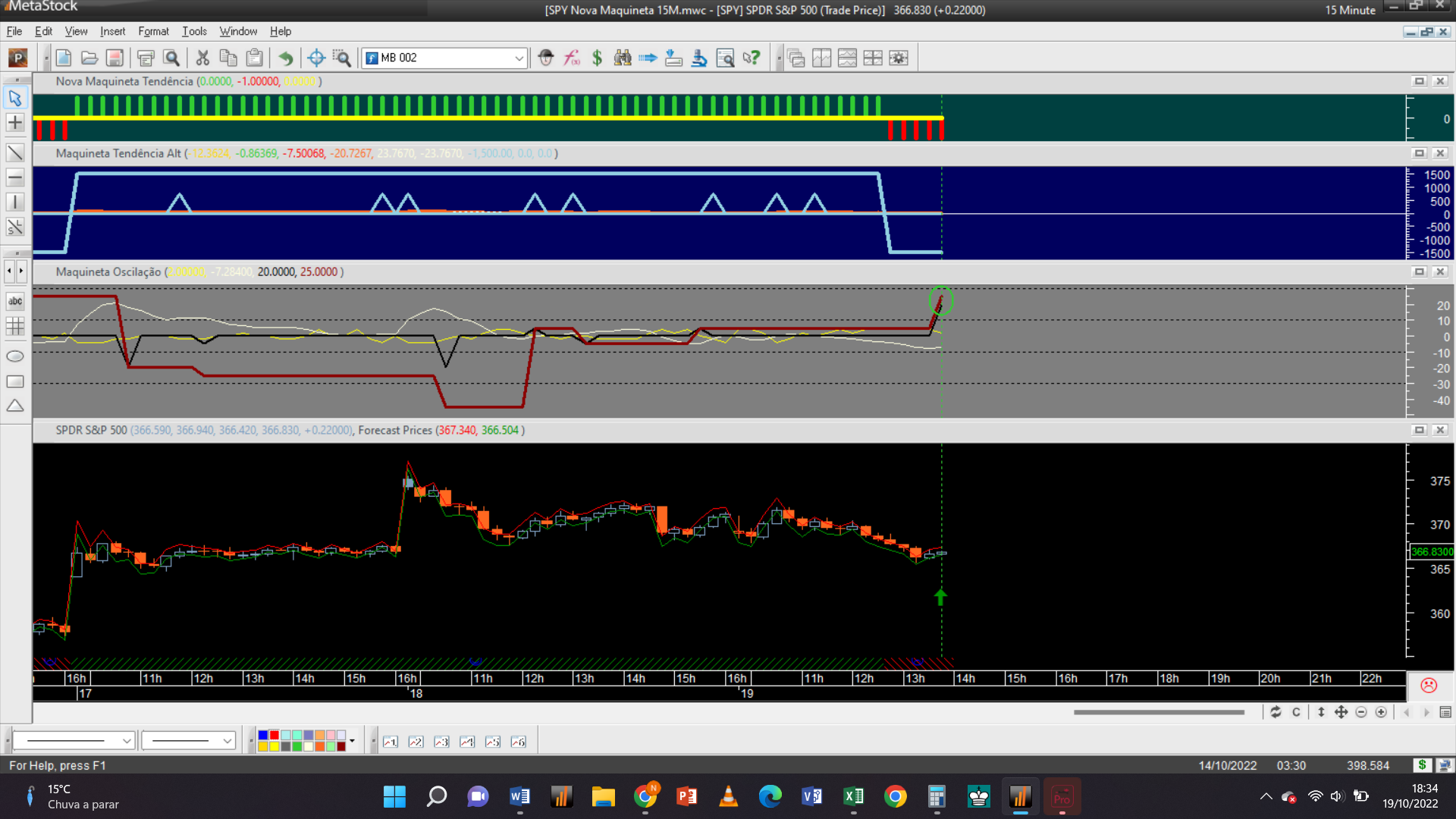 Antes de fornecer aqui a próxima trade permitam-me efetuar um aviso: troquei o gráfico dos 2 dias pelo de 15 minutos, que à semelhança da escala de meia hora só possui autorização para trades do tipo oscilatório, porque detetei que o gráfico 2D padece dum problema dum “bug” curioso de origem, que acabei de detetar e que terei de relatar ao suporte de clientes da plataforma do Metastock.