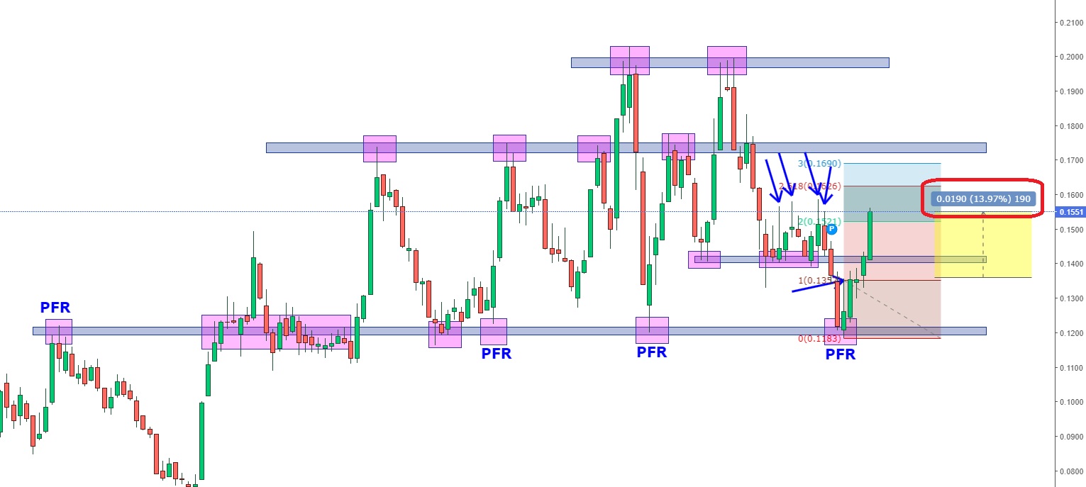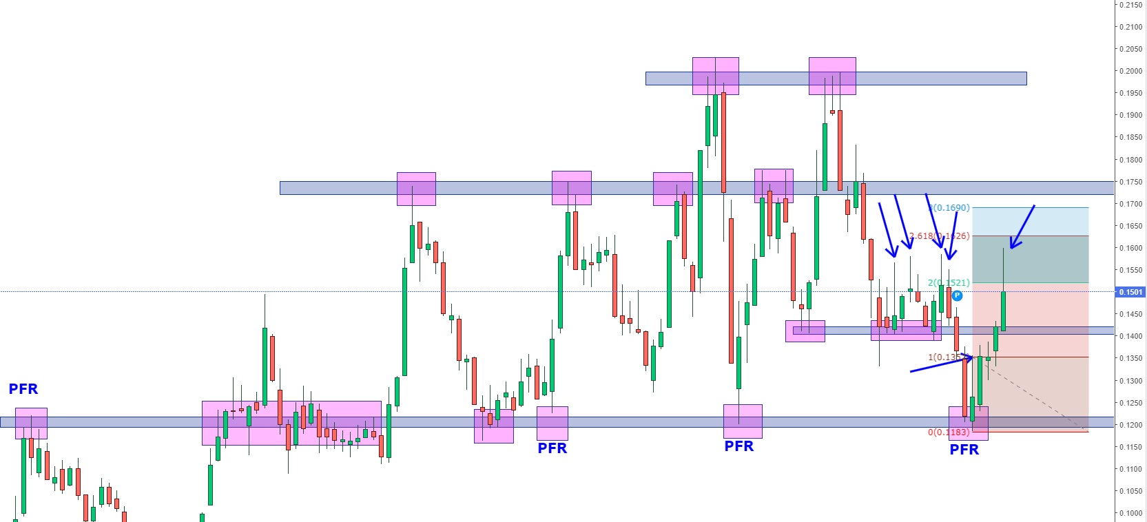 Se o PFR de baixa for ativado (0.1490/0.1495), podemos ter um pullback à zona dos 0.14/0.1420, com stop muito caro nos 0.16!