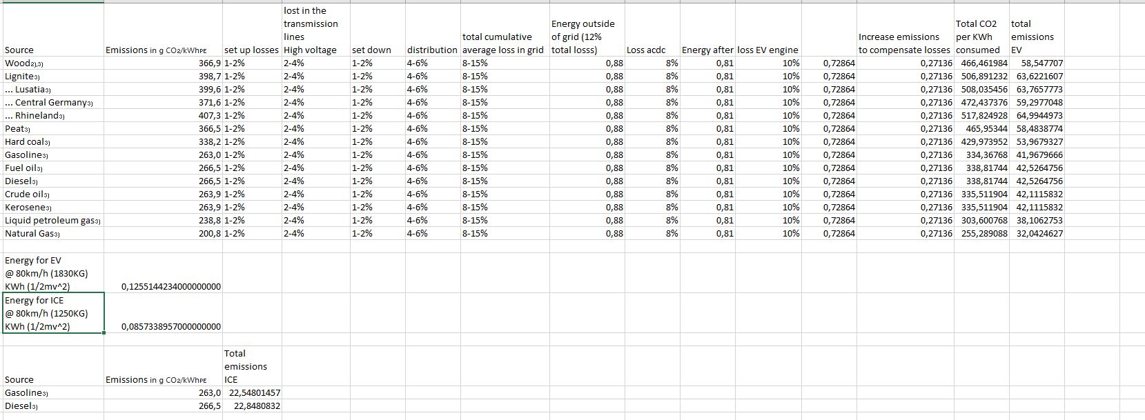 E este excel que já colocaste duas vezes está claramente incompleto, eu não percebo bem o que é que se pretende mostrar ali. Qual é a fonte? O excel é teu? Se é teu continua incompleto. Se é de outra fonte, idem. Face ao original acrescentou uma estimativa das emissões por kWh de diferentes fontes mas continua com o problema original de saltar de uma formula física para a energia cinética do veículo (aparentemente a velocidade Cruzeiro) para o consumo (o que não é verdade nem para o eléctrico nem para o de combustão interna). Há um avanço, acrescentando mais alguns dados, mas o problema fundamental que eu já tinha apontado logo no primeiro post mantém-se.