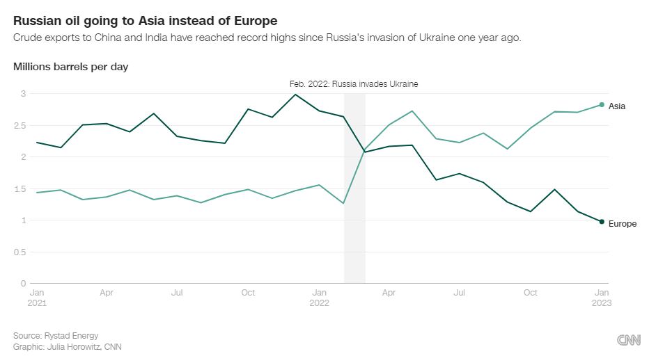 Russia’s oil exports to China and India both hit record highs in January after Europe’s ban on seaborne Russian oil took effect, according to Kpler, a data and analytics company. Exports to Turkey, another top customer, also continued apace. (The ban on refined oil products did not kick in until February.)