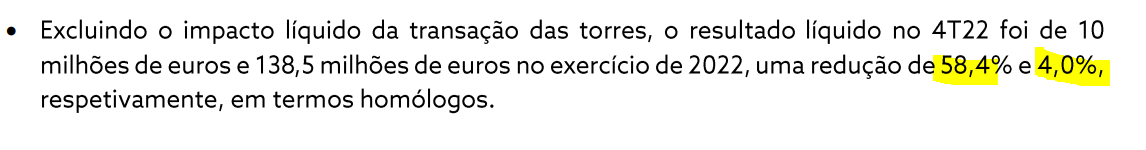 Os bons resultados da NOS no ano de 2022 resultam de um evento não recorrente, extraordinário. Não fora esse evento, e os resultados da NOS teriam sido negativos, a saber: de 10 milhões de euros no 4T22 e de 138,5 milhões de euros ao longo do ano de 2022. Uma redução, respectivamente, de 58,4% e de 4%.