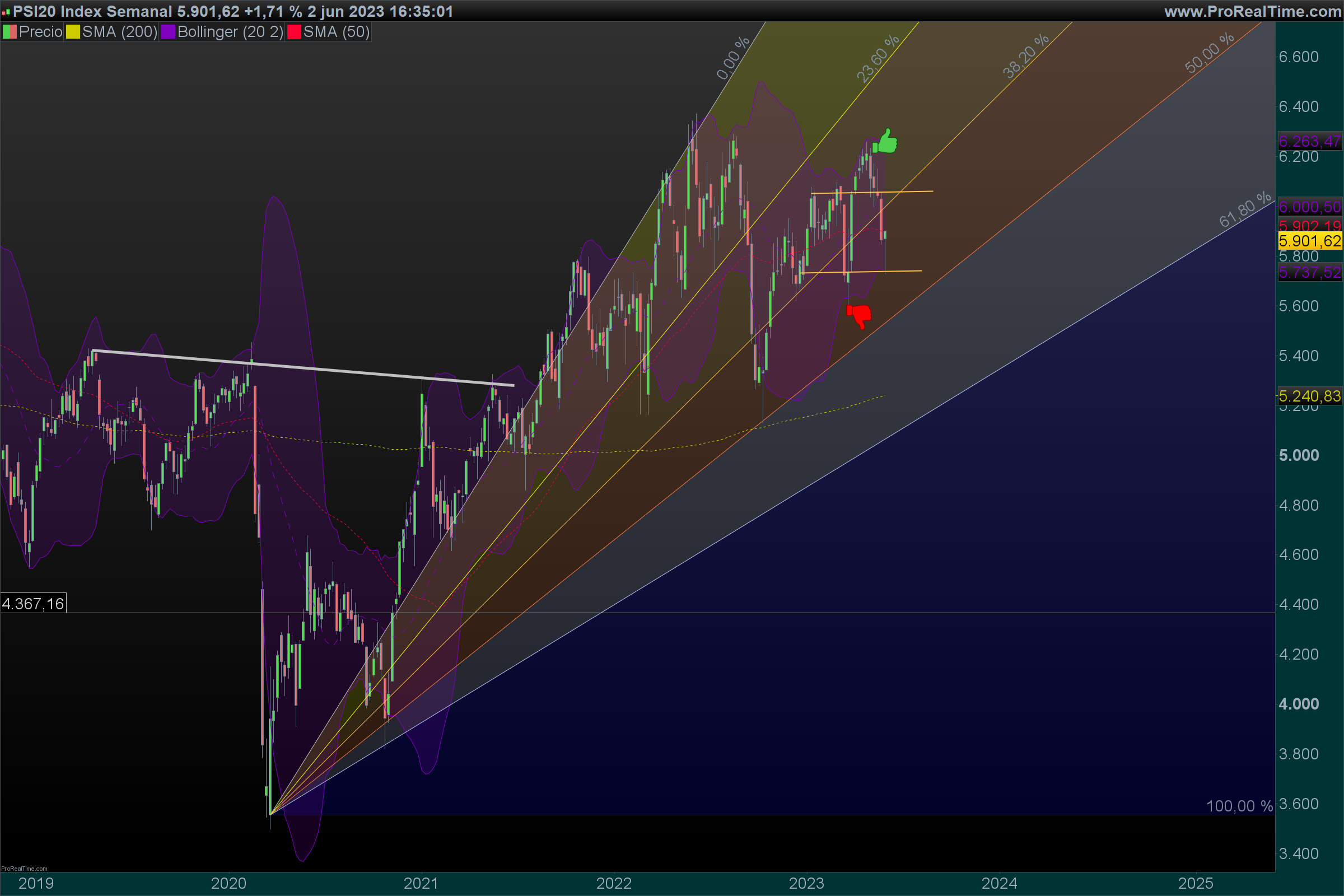 Resumindo, o mais importante neste momento é que a tendência do PSI20 é ascendente desde 2020 e que deixa de ser ascendente se descer abaixo de 5292.