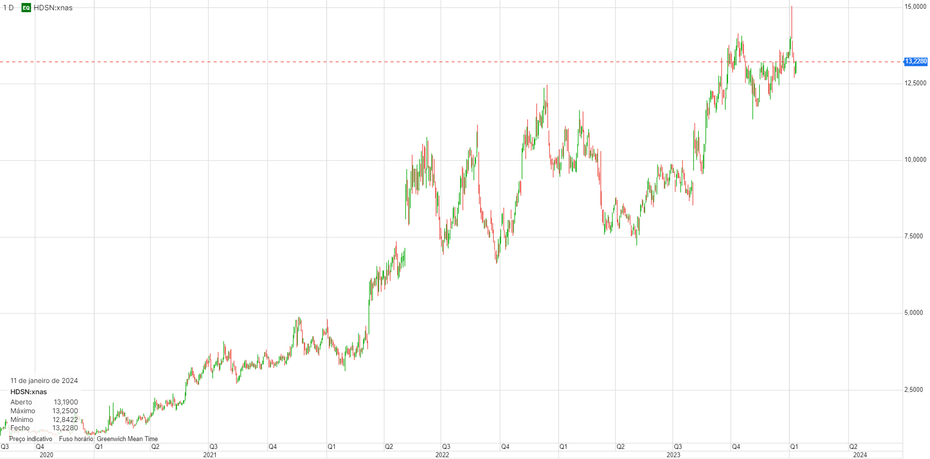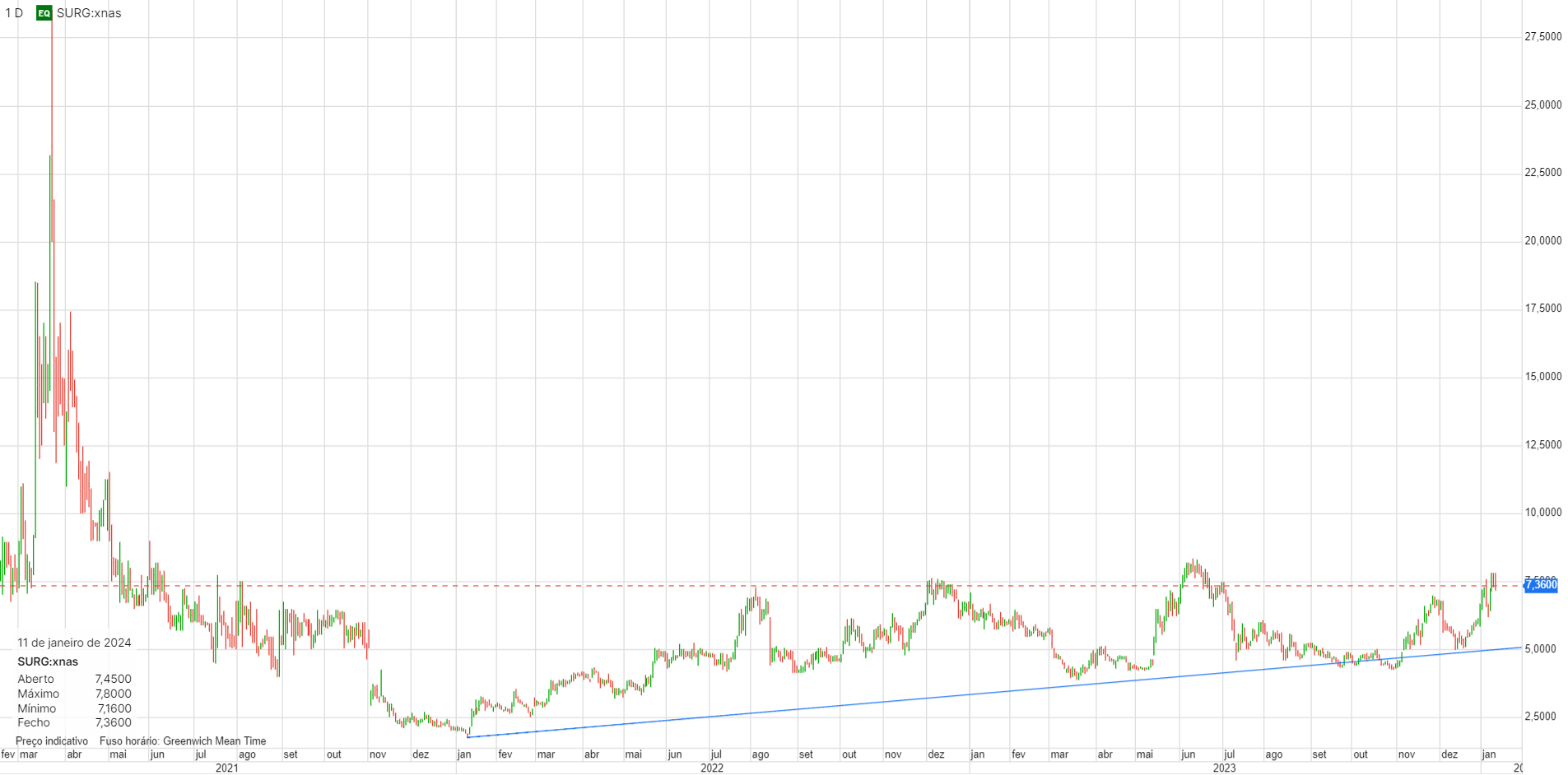 Vem de uma longa queda, estabilizou durante algum tempo e depois disso, no último meio ano já subiu 1000%