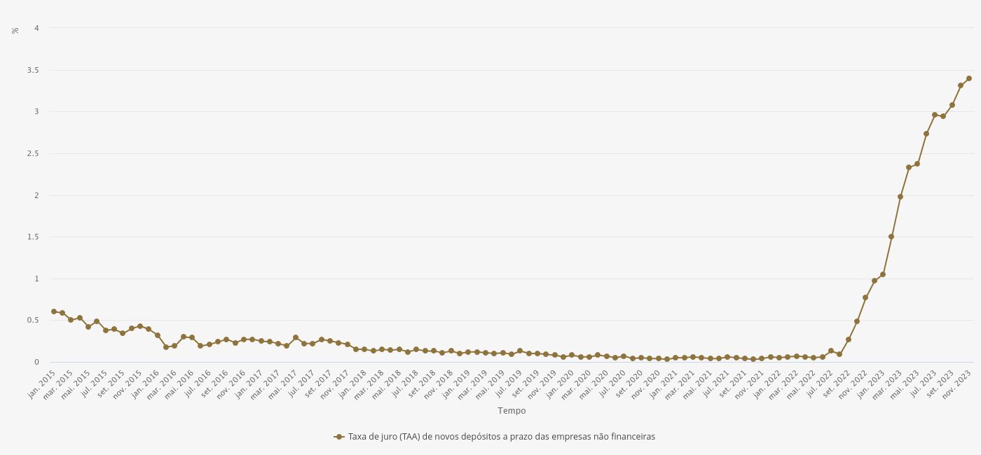 Taxa de juro (TAA) de novos depósitos a prazo dos particulares e empresas não financeiras: 3% e 3.4%