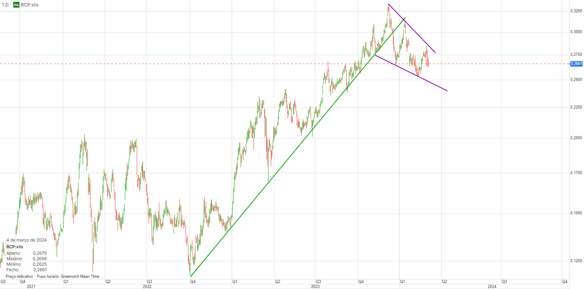 Poderá também estar a fazer uma flamula, que é um padrão de consolidação e que normalmente ocorre a meio do movimento, neste caso após as subidas de 2023. A vantagem destes padrões, é que são relativamente simples de negociar e tem uma boa taxa de eficácia. Mas convém esperar pela quebra, neste caso em alta, da figura.
