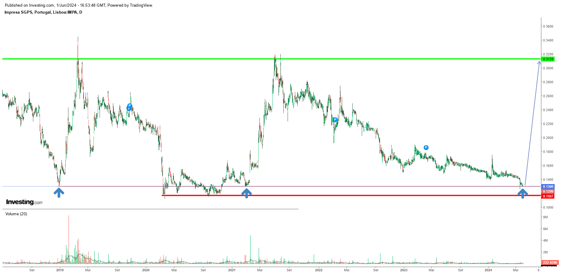 A Impresa está num ponto chave, pode quebrar a zona dos 0.13 € e pode ir até mínimos na casa dos 0.115 € de salientar que a zona dos 0.13€ funcionou bem como suporte em 2018 e em 2021 e nessas alturas teve uma valorização até á casa acima dos 0.3 € por ação, até podem dizer que está falida mas eu não creio e penso que estamos num ponto chave com uma possível alteração de tendência não esquecer que os juros a baixar vão ajudar nas contas.