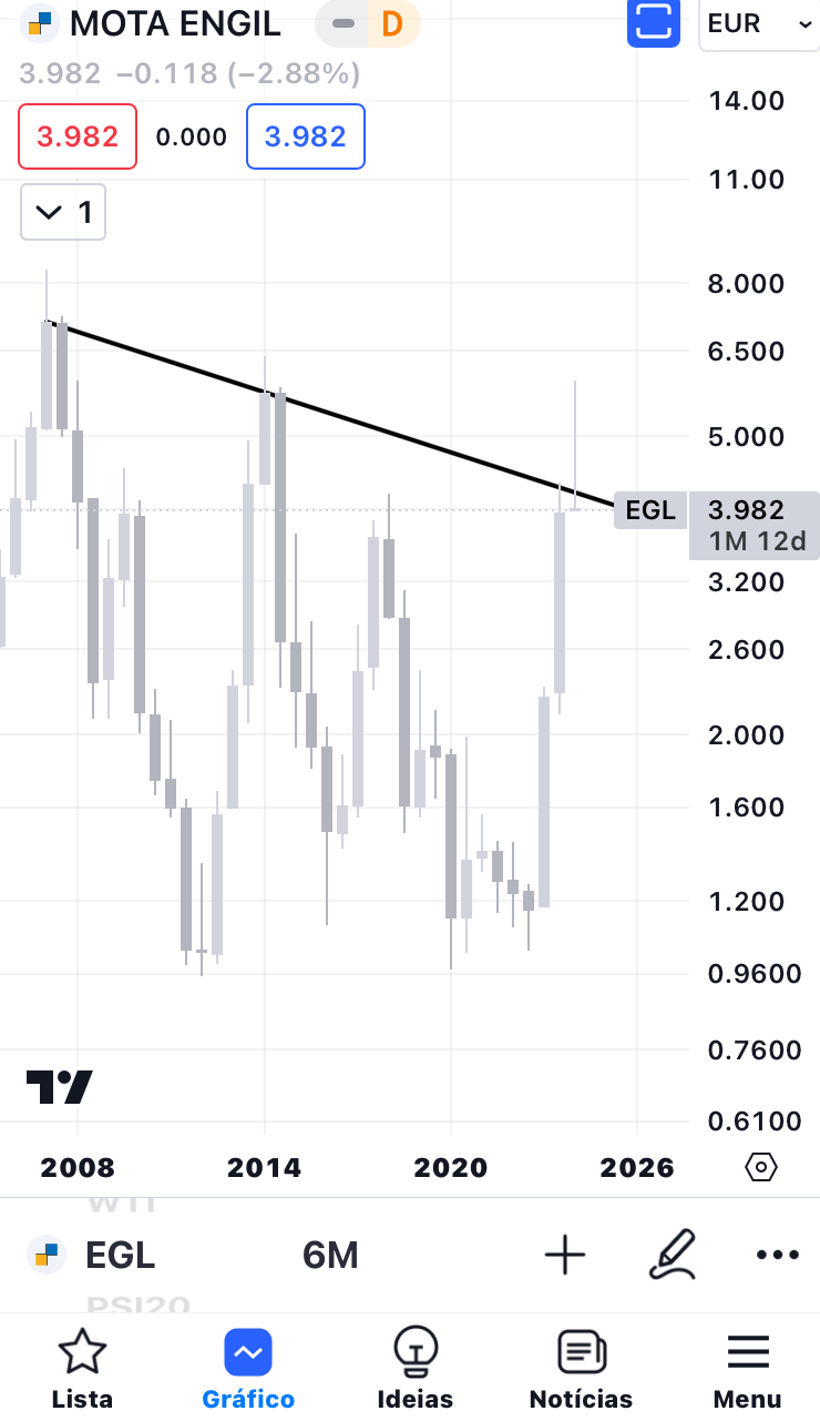 No tópico que criei coloquei um gráfico da Mota-Engil, que continua valido, e que penso que se percebe, porque pode descer, e por acaso ontem voltei a dizer que estava menos otimista em relação à Mota-Engil e acrescentei a Galp, que também desceu hoje.