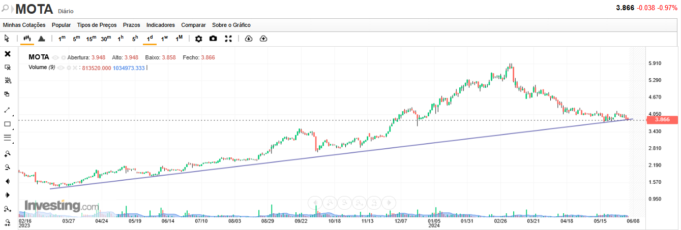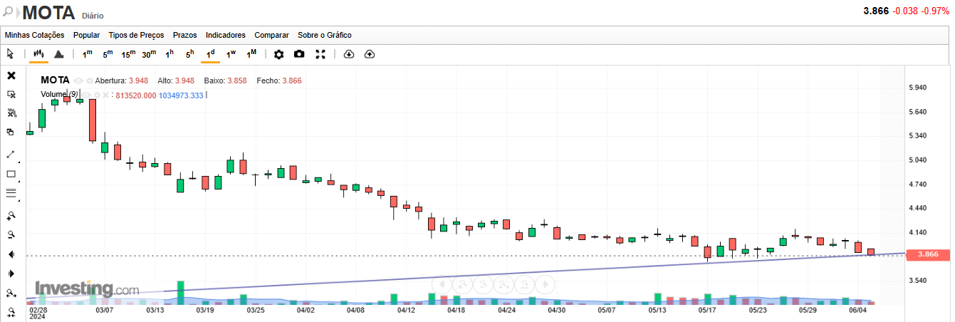 Eu já aqui escrevi que quando a Mota desce não vale a pena tentar apanhar fundos. É deixa-la cair, porque as quedas são violentas. Todo o histórico da ação assim o diz. O contrário também é verdade. Quando sobe, é comprar e estar quieto. A tendência da Mota é de queda e para já não há qualquer sinal de inversão de tendência.