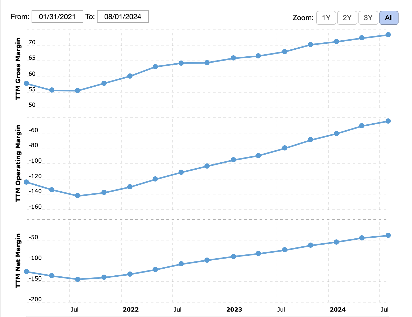 A margem operacional está actualmente em -44.9% (TTM). É um valor ainda bastante negativo, mas em 2021 estava abaixo dos -100%. A melhoria da margem operacional tem sido muito significativa o que sugere que poderá passar para valores mais comportáveis num futuro próximo. Apesar do elevado valor negativo, a melhoria das margens justifica uma avaliação positiva.