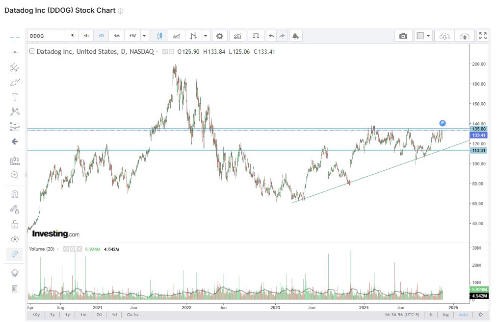 Este título já esteve cotado próximo dos $350 quando o crescimento das receitas era de três dígitos. Desde o final de 2021 que tem vindo a cair. Neste momento parece ter um sólido suporte nos $50.