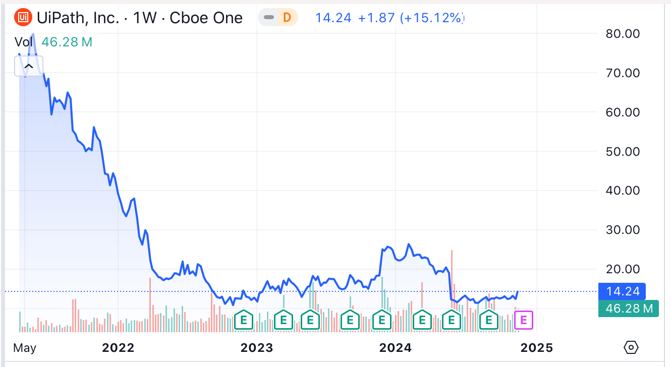No último trimestre do ano fiscal de 2024 (4Q24), que para a PATH terminou a 31 de Outubro de 2023, a empresa renasceu qual fénix. As receitas cresceram 31% e pela primeira vez na sua história apresentou lucros GAAP. A cotação disparou. No entanto, no trimestre seguinte (1Q25) a taxa de crescimento de receitas caiu, as previsões de receitas anuais baixaram, os prejuízos voltaram, o CEO partiu e a cotação colapso. No último trimestre (2Q25) as coisas melhoraram ligeiramente. O fundador e ex-CEO Daniel Dines reassumiu o cargo de CEO, as receitas superaram as expectativas e o Outlook para 2025 foi melhorado. Ainda assim, a empresa apresentou uma pesada margem operacional de -33%. Esta margem é explicada pelo facto do segundo trimestre produzir historicamente baixas receitas o que comprime a margem operacional.