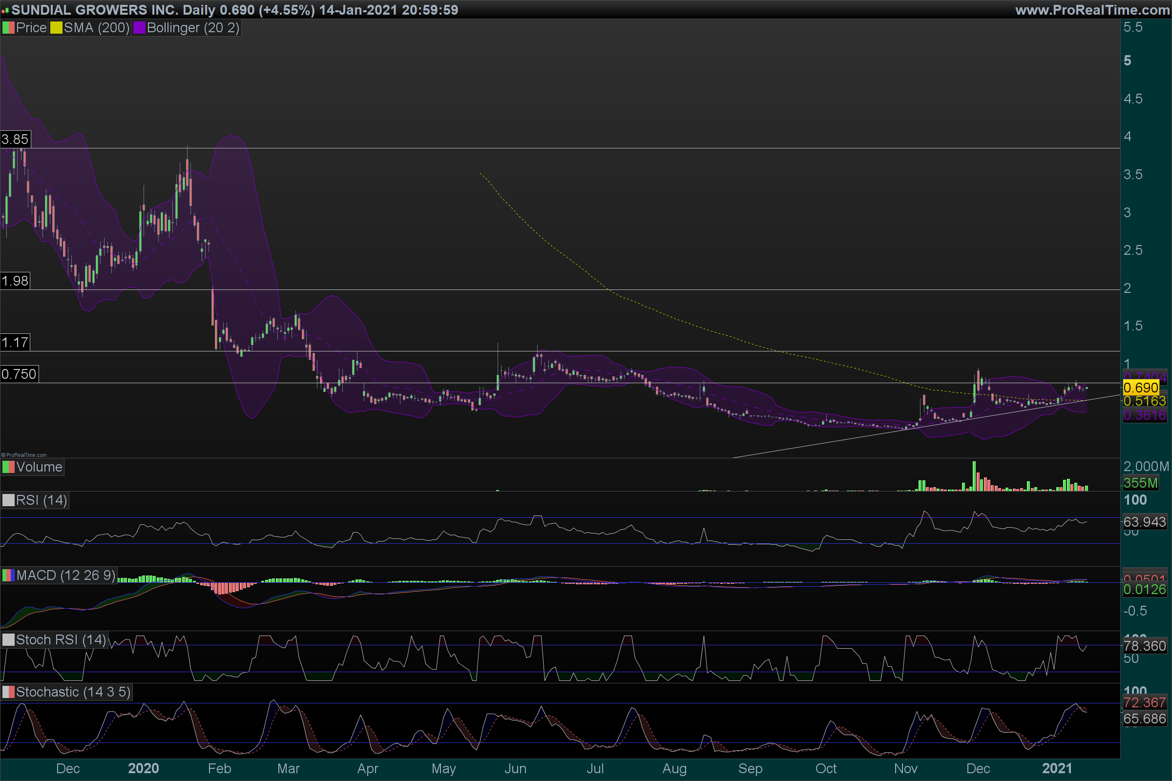 Pelo contrário a Sundial e Aurora continuaram com quedas bastante expressivas. Inicialmente tiveram subidas muito agressivas, a Sundial chegou a subir 500% em poucos dias, notem que cotou a 0,16 e agora esta ainda a 0,7 a Tilray so agora esta a cotar 4x os mínimos.