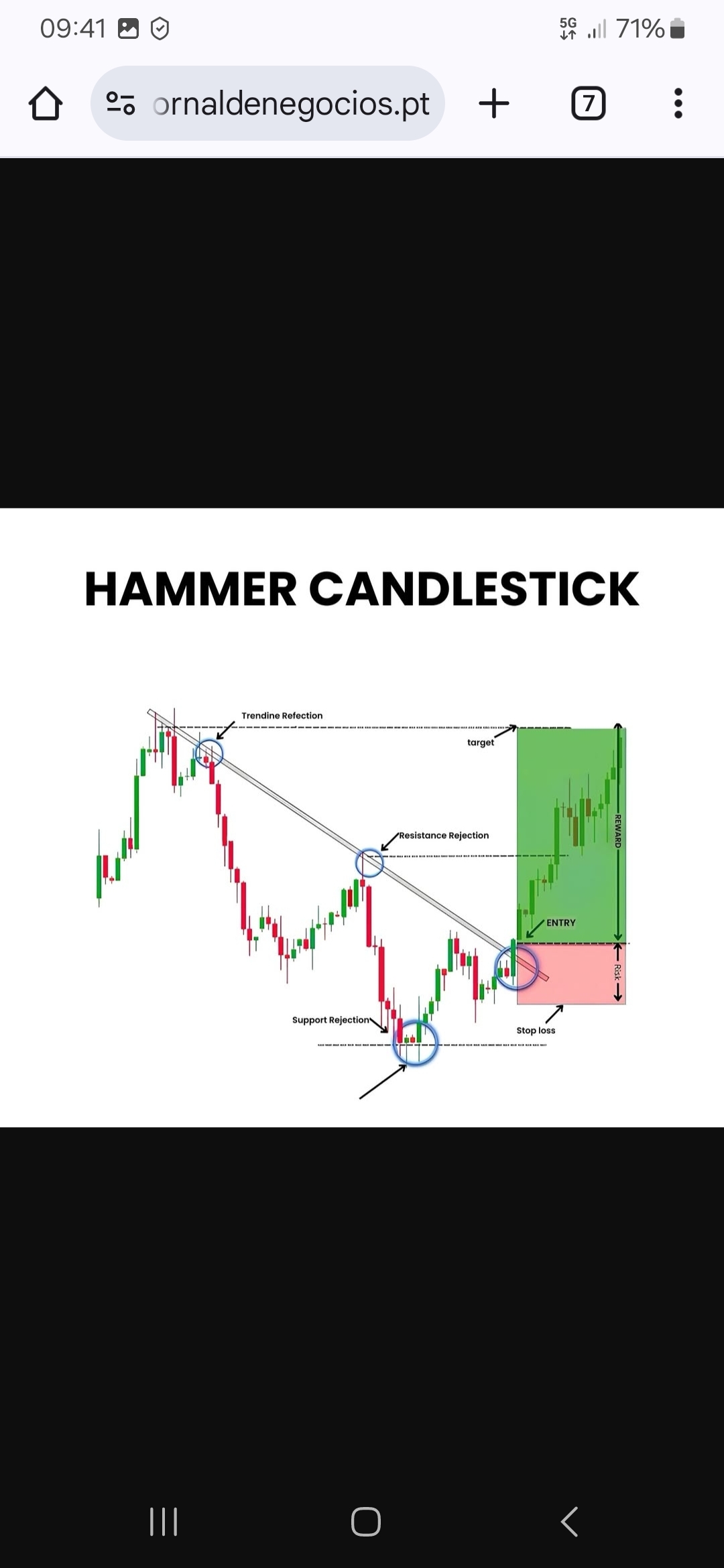 A imagem ilustra um cenário típico de reversão de tendência, recorrendo a um padrão de vela conhecido como “Hammer” (martelo). Observa-se uma descida prolongada marcada por topos e fundos descendentes, confirmada pela linha de tendência inclinada para baixo.