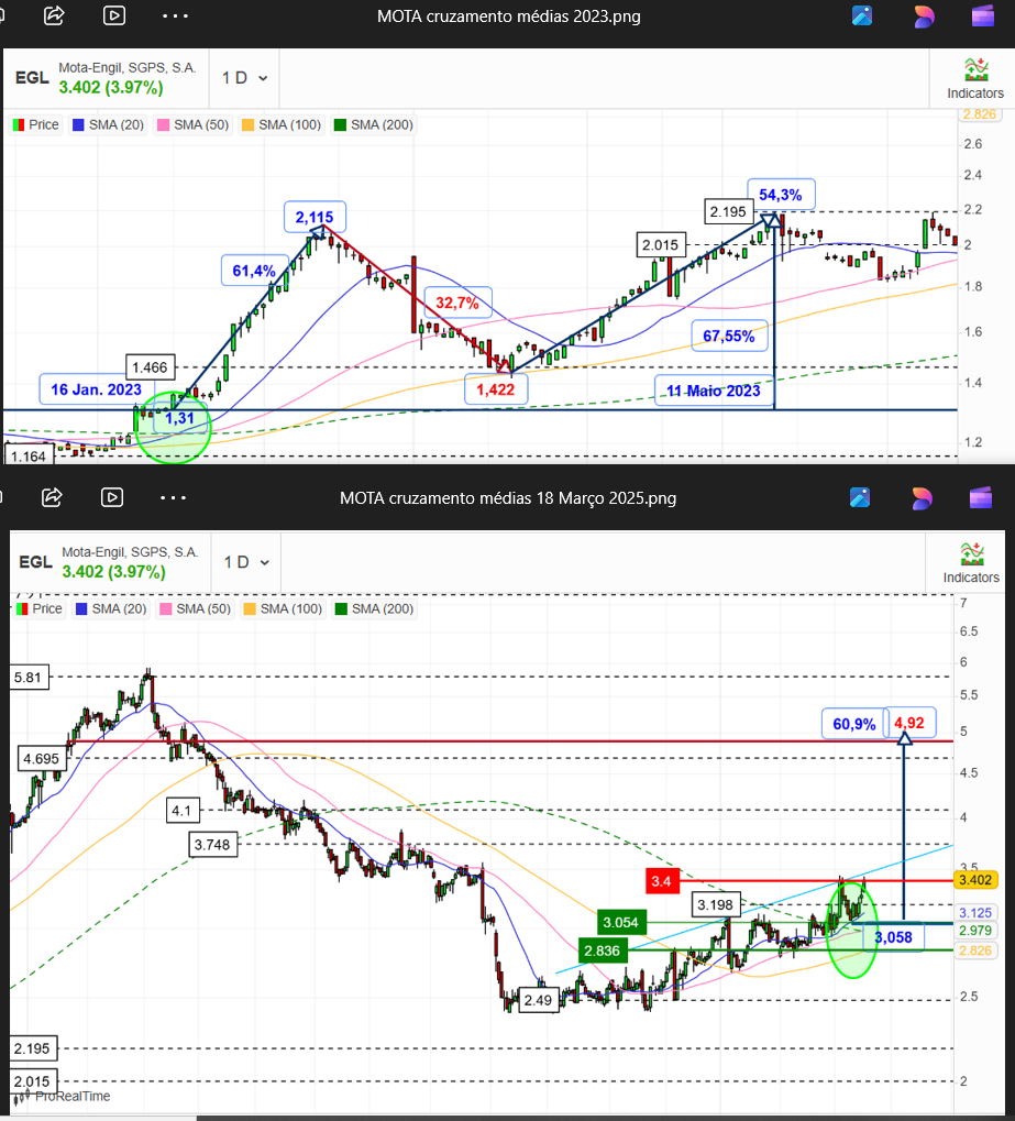 O cruzamento das médias verificado hoje , para comparar com o respetivo cruzamento em 2023. E a progressão das cotações.
