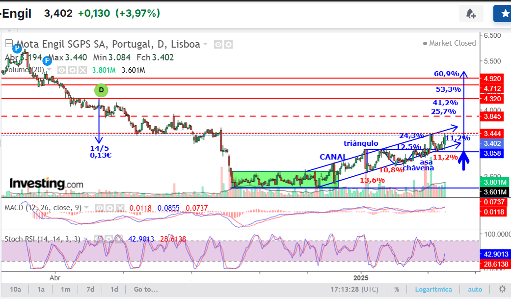 Na minha analise, a Mota embora tudo indique que vai para norte, ainda não será desta, esta a bater na linha de tendencia, bem como o rsi está esticado para tal, e tem pela frente uma resistencia bem grande. ( só palpites)