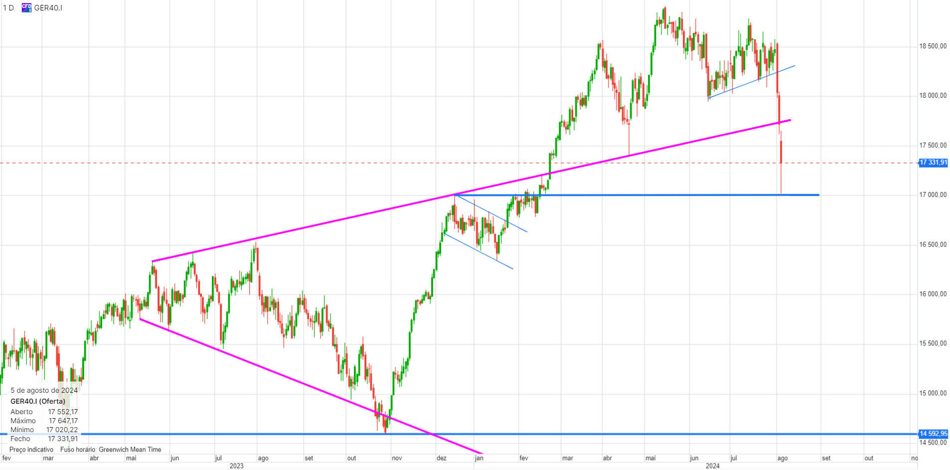 ontem fiz uma entrada longa no dax (17560, na abertura à noite) à espera que a linha a rosa segurasse o indice. Tal não aconteceu, mas os 17000 fizeram-no. Ainda tenho essa posição (perdedora), mas a reação nos 17000, e o facto de ter caído 1500 pontos em 3 sessões, faz-me acreditar que ainda poderei ter algum lucro com ela, já que poderá haver alguma reação. As decisões serão na linha a rosa, que estará amanhã nos 17750