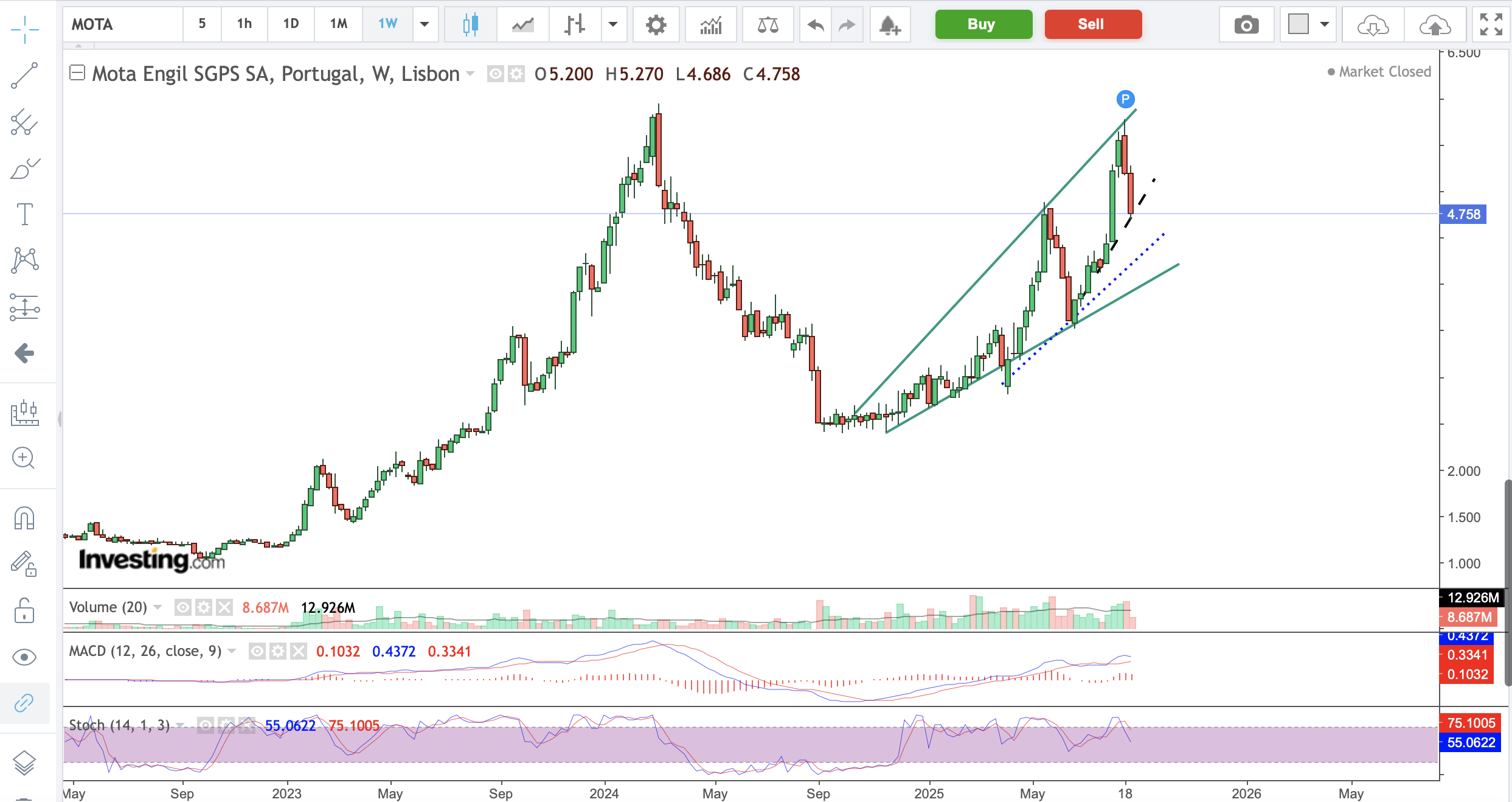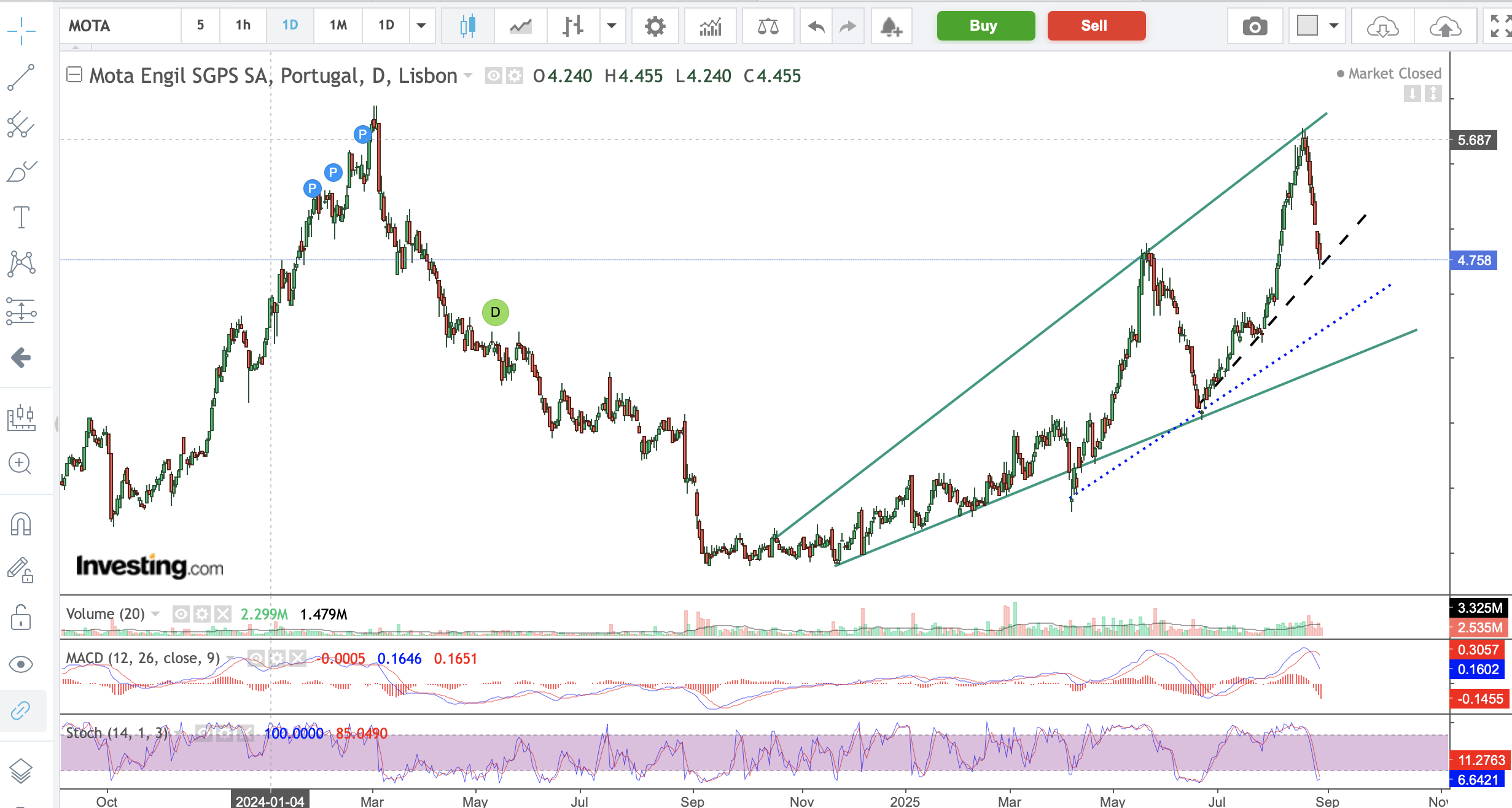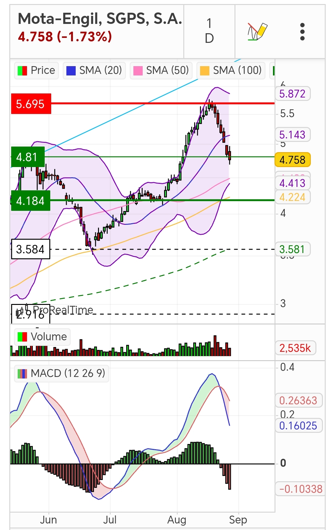 Gráfico com o MACD + Bandas Bollinger + média móveis mostram o caminho a curto prazo. Fiz vários traders na Mota sempre com ganhos. Agora queria continuar a ganhar, porém......como diz o outro....."mais vale perder um ganho que ganhar uma perda". Quem entrou extemporaneamente que tenha paciência pois o trend de fundo é de alta. Espero ter ajudado.