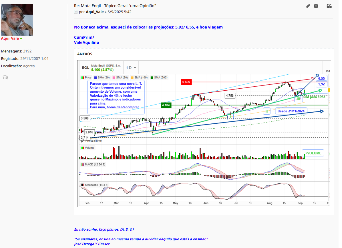 Na minha opinião a Mota está, neste momento, prestes a fechar o padrão Cup & Handle com esse declive descendente e teremos a confirmação quando a neckline for quebrada em alta e a cotação fechar acima dos 5.70€ (será já amanhã?