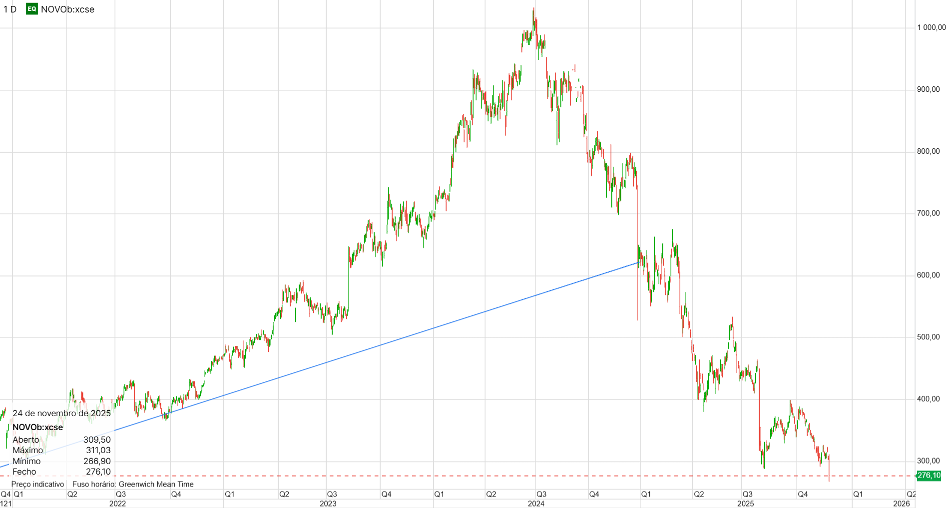 Títulos da farmacêutica dinamarquesa atingiram mínimos de julho de 2021.