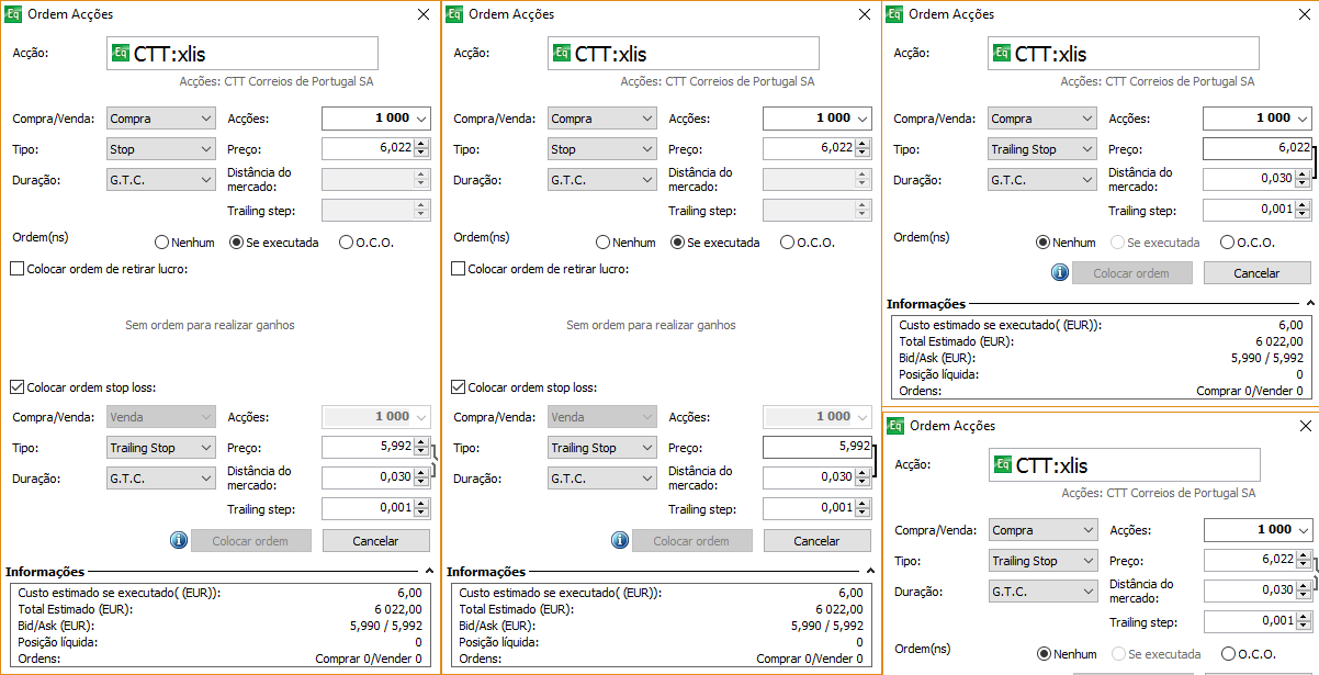 - Neste caso, a trailing entra logo a funcionar porque o preço está bloqueado ao preço de mercado.