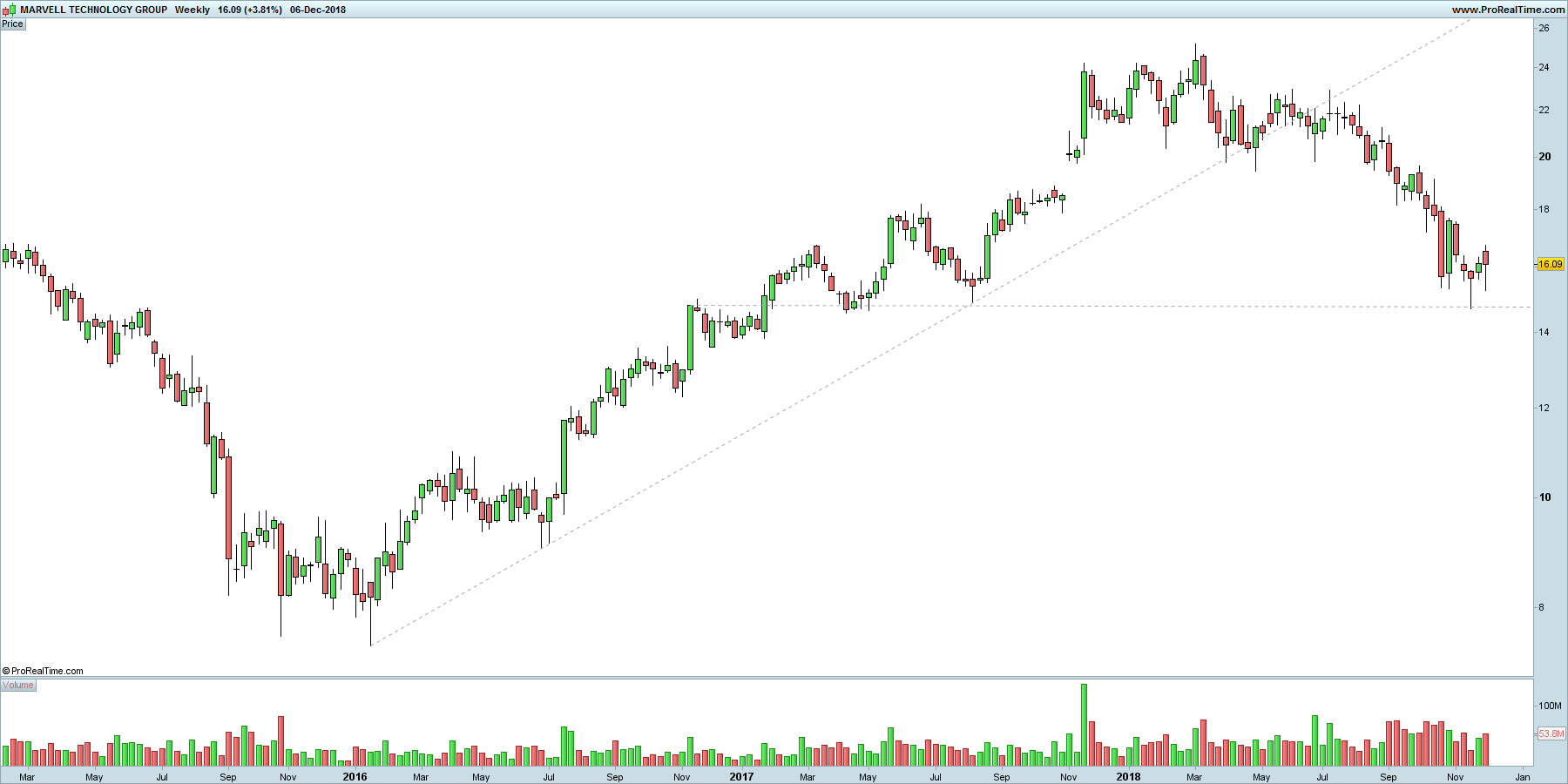Quanto ao curto prazo a Marvell está "entalada" entre o suporte dos 18USD e a resistência dos 22,00 USD. No mês de Novembro formou um triângulo simétrico que acabou por quebrar em baixa o que levou a cotação ao suporte dos 18USD.