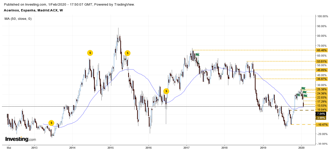 No longo prazo (há mais de 1 ano) a Acerinox segue a transaccionar dentro de um canal de lateralização muito bem definido entre os € 11,90 e os € 15,10, mas isto não a tem impedido de, de tempos em tempos, consolidar ligeiras tendências ascendentes e descendentes.
