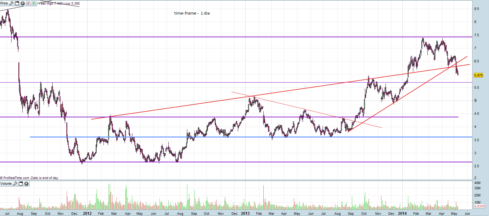 Depois de a ação ter fechado um grande gap e ter testado uma forte resistência em torno dos 7.5€ com a formação de um duplo topo, está agora em queda, ficando com mau aspeto após ter quebrado duas linhas de tendência, aproxima-se agora de um suporte em torno dos 5.65, 5.75 (mais ou menos), a ver como vai ser a reação.